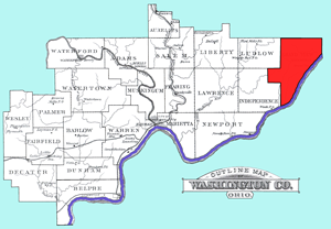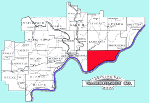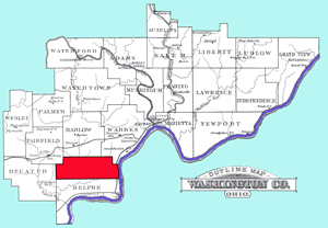 Established on December 20, 1790. Belpre was one of the three original townships of Washington County. Originally named "Belle Prairie" meaning "beautiful meadow." In 1797, the Court of Quarter sessions decided that all the territory south of Waterford & Marietta townships embracing parts of the present counties of Athens, Vinton, & Ross, together with fractions of Hocking, Meigs, Jackson, and Pike as they stand today [1881]. The lines marked out in 1790 bounded north by territory now embraced by Warren, Barlow, Fairfield, east and south by the Ohio River [Wood County, (W)Virginia], and west of what became Athens County, Decatur & a section of Fairfield twp. In 1856 Town #1, Range 9 and Town #2, Range 10 were bisected from east to west and the northern division incorporated into Dunham township. The city of Belpre was incorporated on July 2, 1901.
